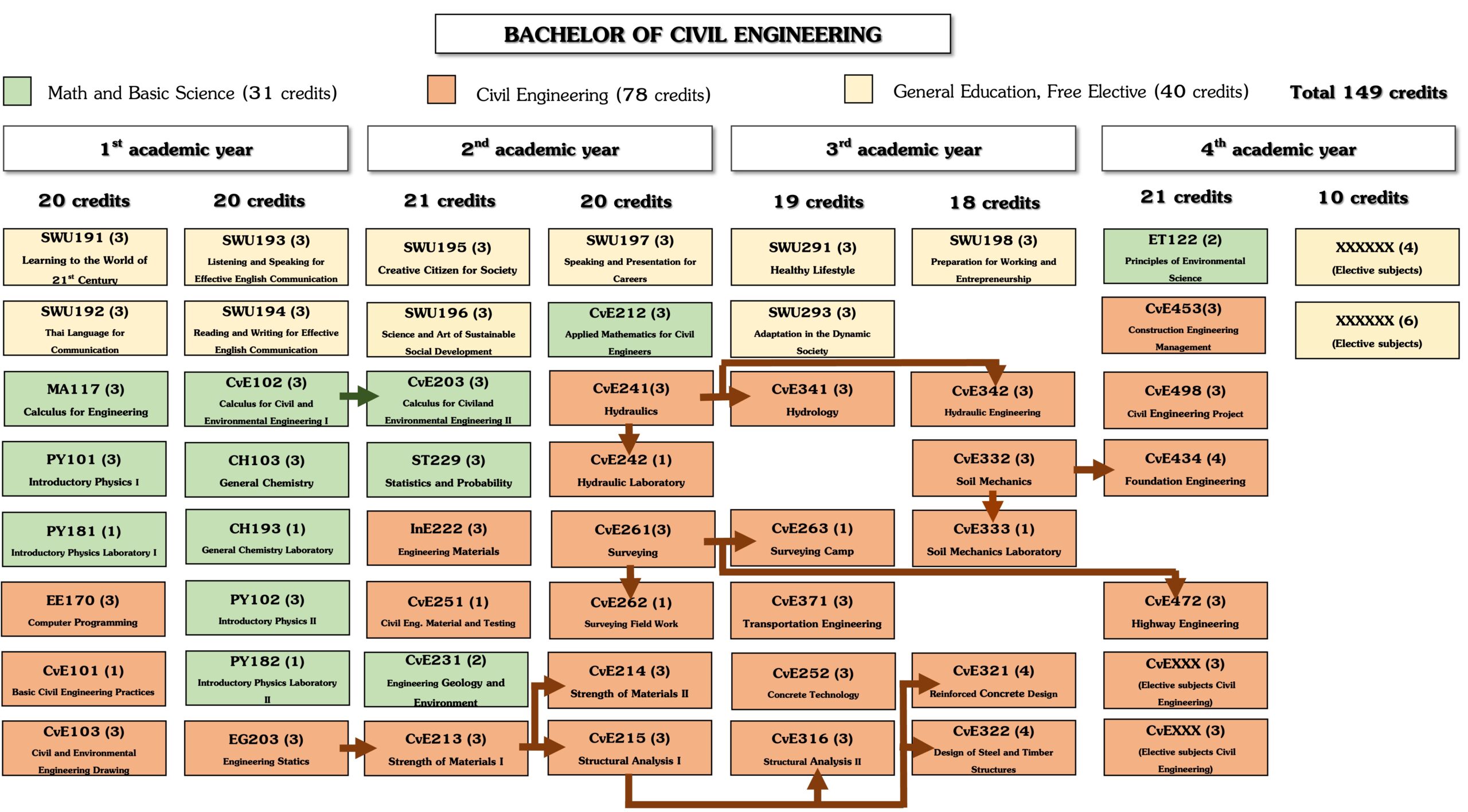 The Civil Engineering curriculum has been deliberately designed in the flowchart of our program curriculum is illustrated in Figure 1. The prerequisite structure of the program’s required courses are also presented in Figure 1. as arrow lines. These prerequisite requirements are also regulated by the Council of Engineering of Thailand (https://en.coe.or.th/).